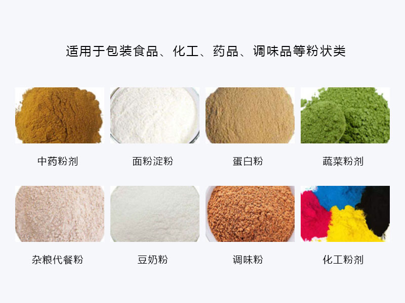 3:本機(jī)適用于包裝食品、化工、藥品、調(diào)味品等粉狀類的物料包裝。如:蛋白粉、益生菌粉、芝麻粉、奶粉、香料粉、茶粉等物料。